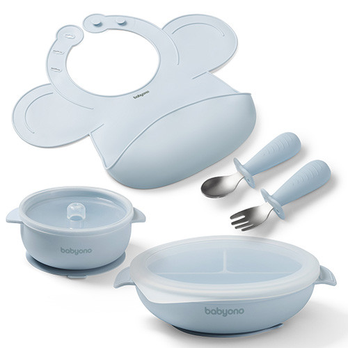 Kék baba csomag (hozzátápláláshoz) Előke, tányér, tál, acél evőeszköz szett + ajándék PDF csomag hasznos tartalmakkal
