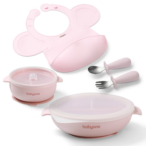Rózsaszín baba csomag (hozzátápláláshoz) Előke, tányér, tál, acél evőeszköz szett + ajándék PDF csomag hasznos tartalmakkal